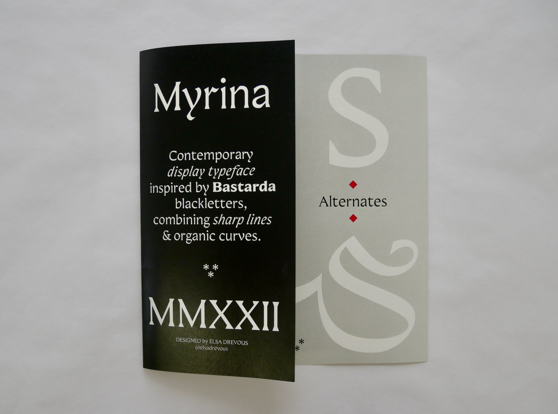 The Myrina typeface combines organic shapes and calligraphic curves, with minimalist lines and sharp angles. The structure of the letters follows a broad nib pen ductus, resulting of strong contrasts. The type family also features 26 alternates caps (from Light to Black) created with lively calligraphic shapes. These special glyphs allow the graphic designers to play with an infinite combination of letter layouts—such as accessories in the fashion industry. These alternates have been created to add a strong gothic identity, with a unique, extravagant touch.